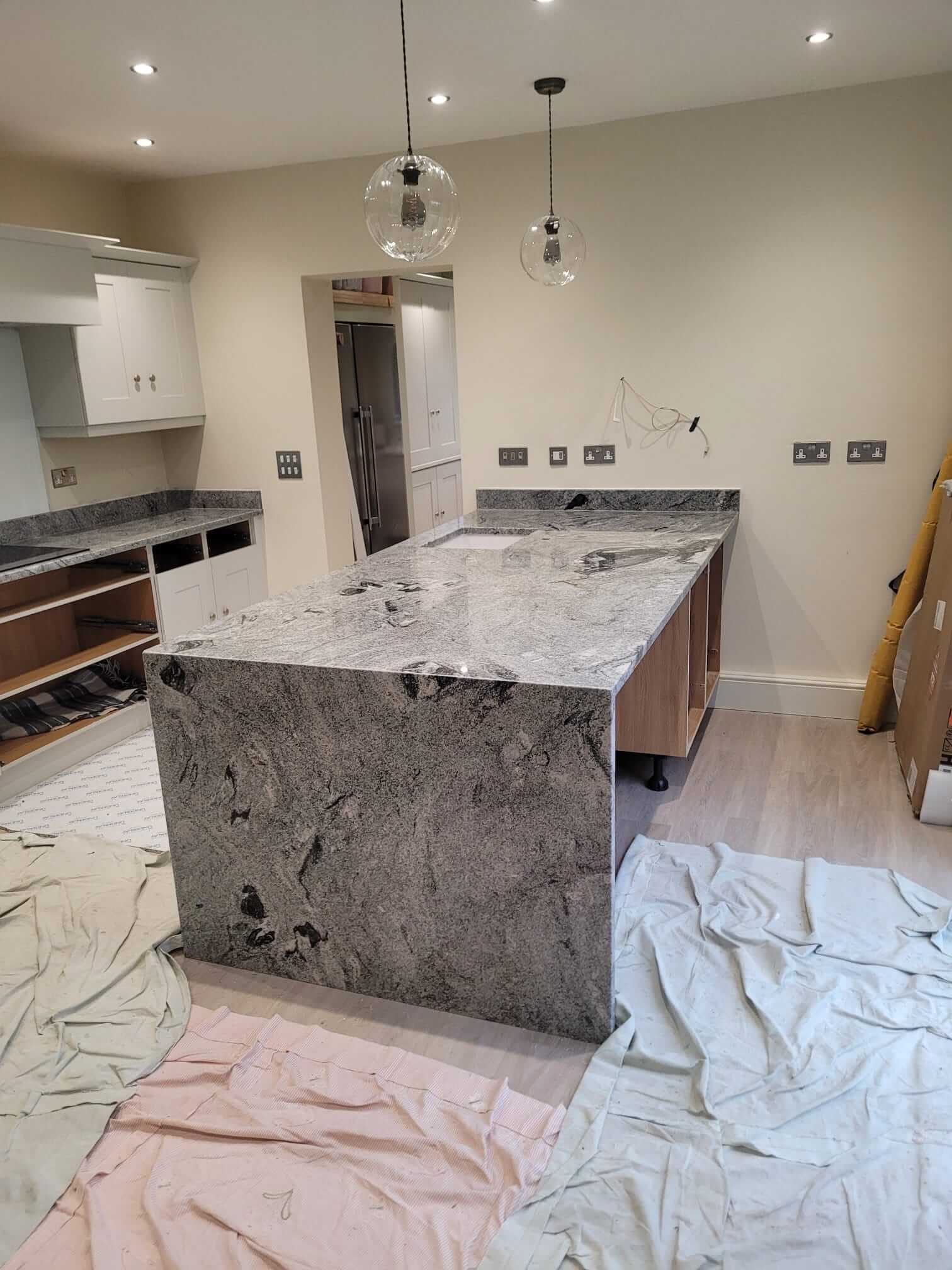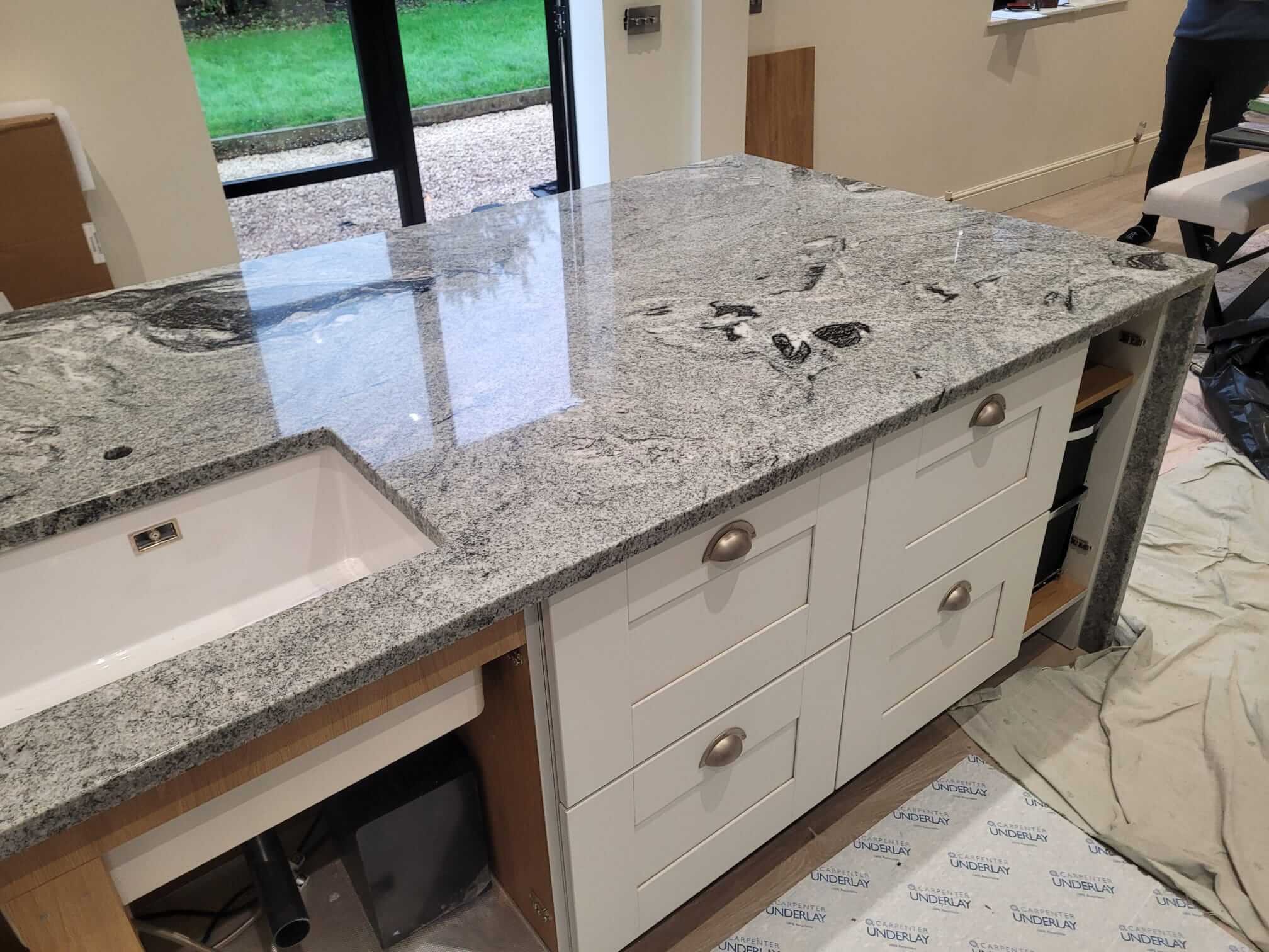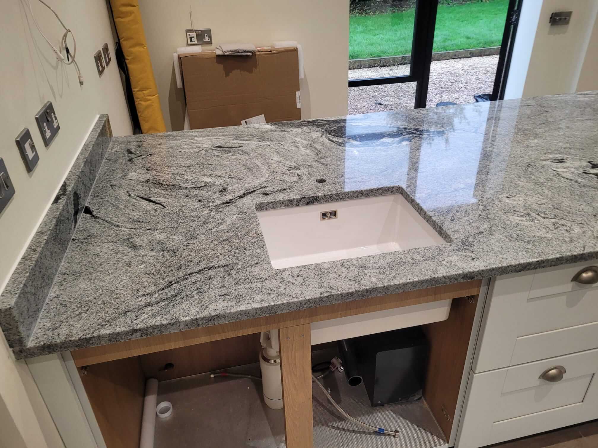 Viscount White Granite is known for its dramatic contrast of light grey and white tones with flowing dark veining. In this kitchen, the natural movement within the stone added character and depth, while the polished finish enhanced the overall brightness of the space. The 30mm thickness gave the worktops a solid, premium presence, particularly on the island where the granite becomes a true focal point.
