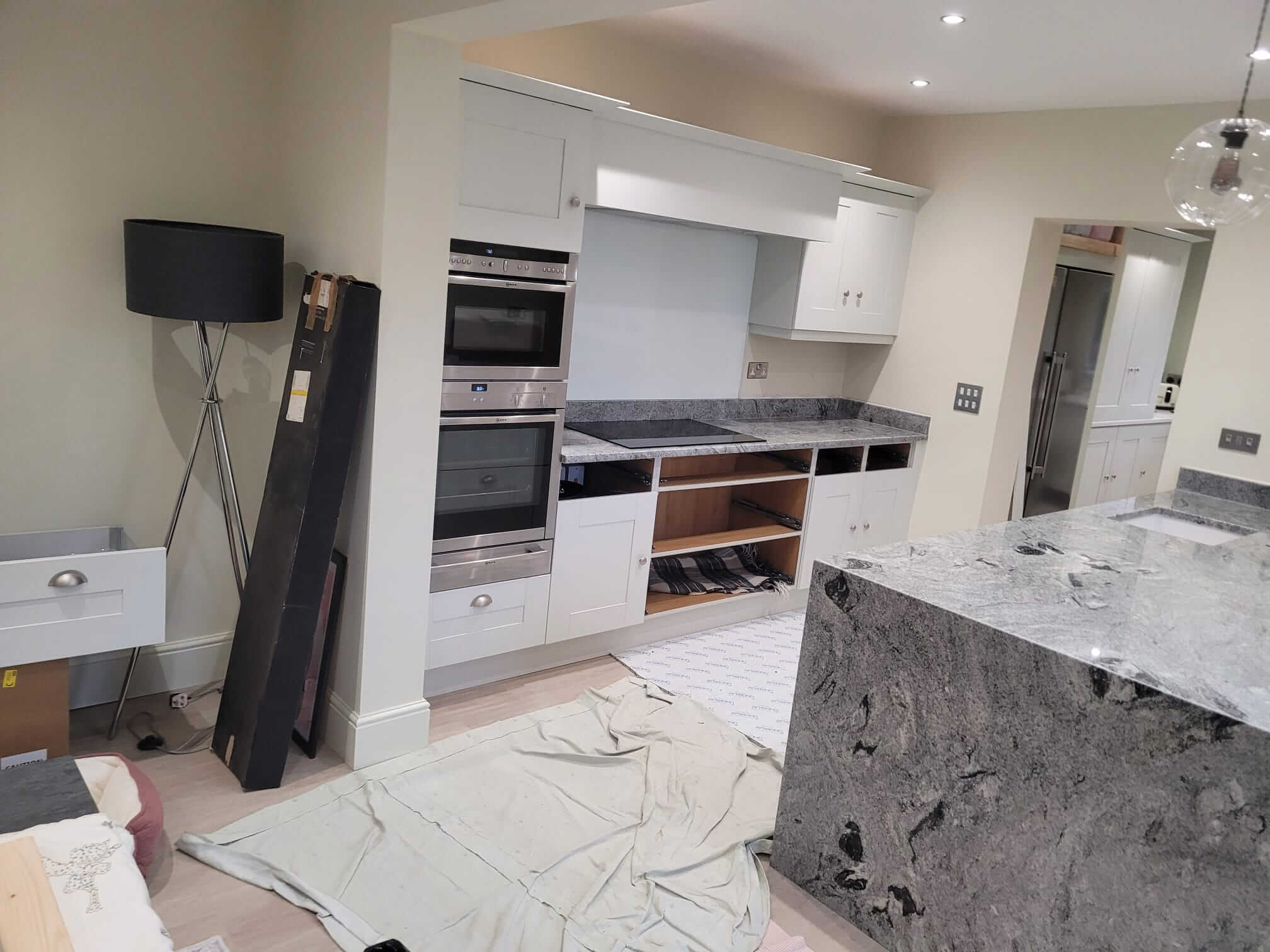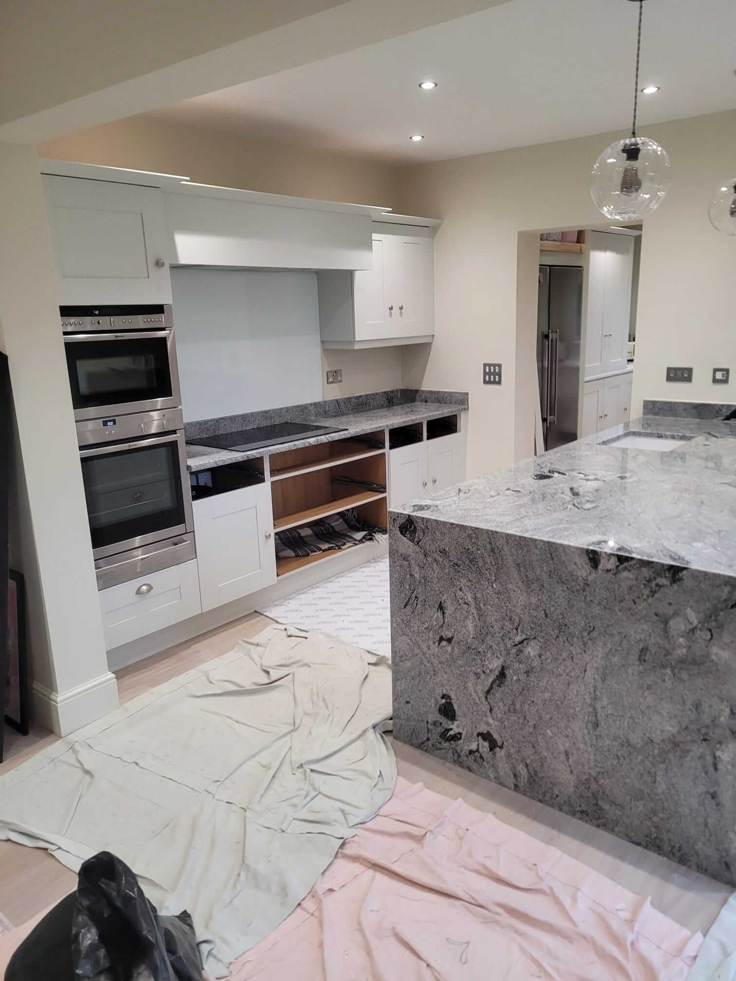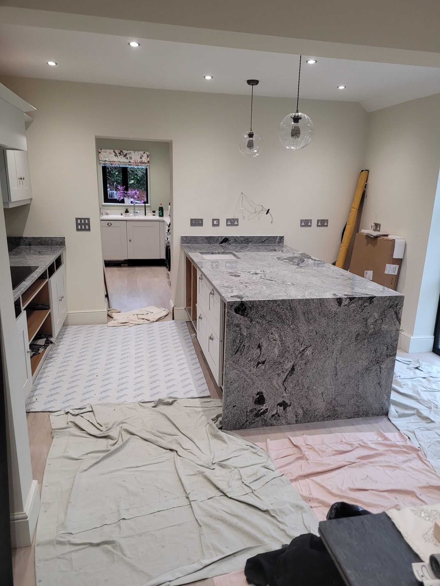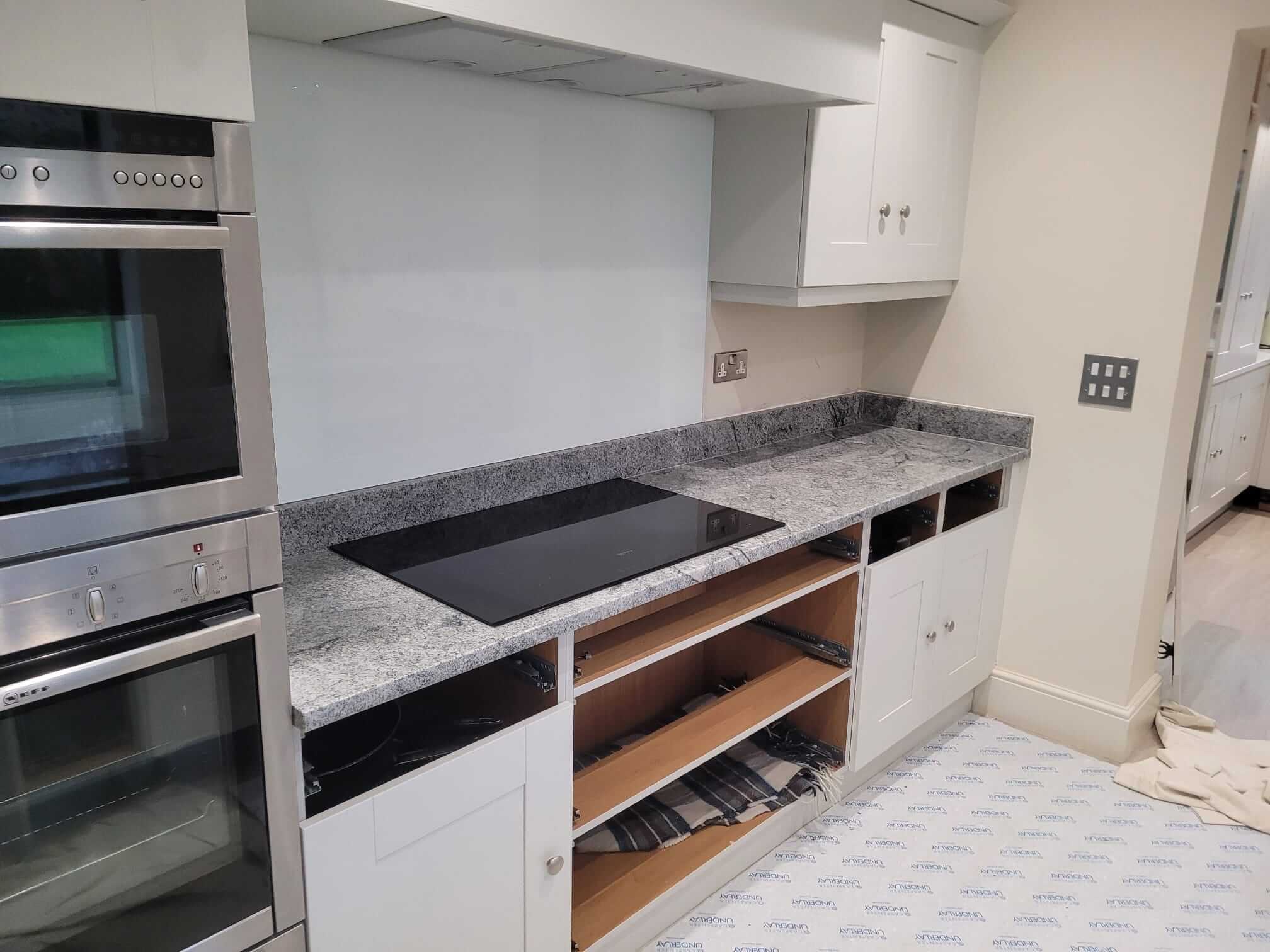 Viscount White Granite is known for its dramatic contrast of light grey and white tones with flowing dark veining. In this kitchen, the natural movement within the stone added character and depth, while the polished finish enhanced the overall brightness of the space. The 30mm thickness gave the worktops a solid, premium presence, particularly on the island where the granite becomes a true focal point.